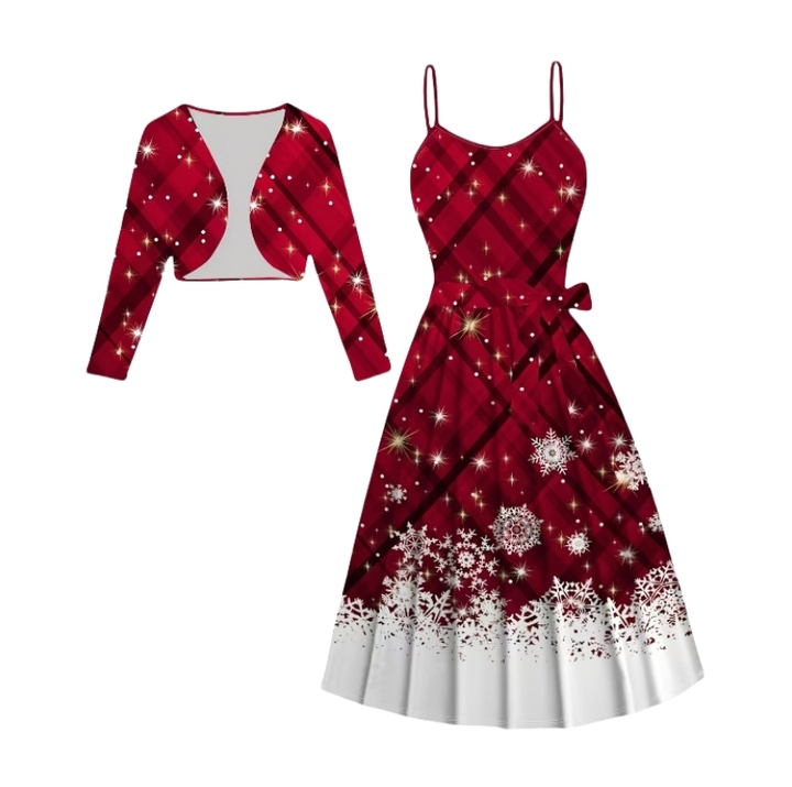 Conjunto de vestido personalizado para mujer, tops con estampado navideño y vestido Midi Halter con cinturón, conjuntos de 2 piezas